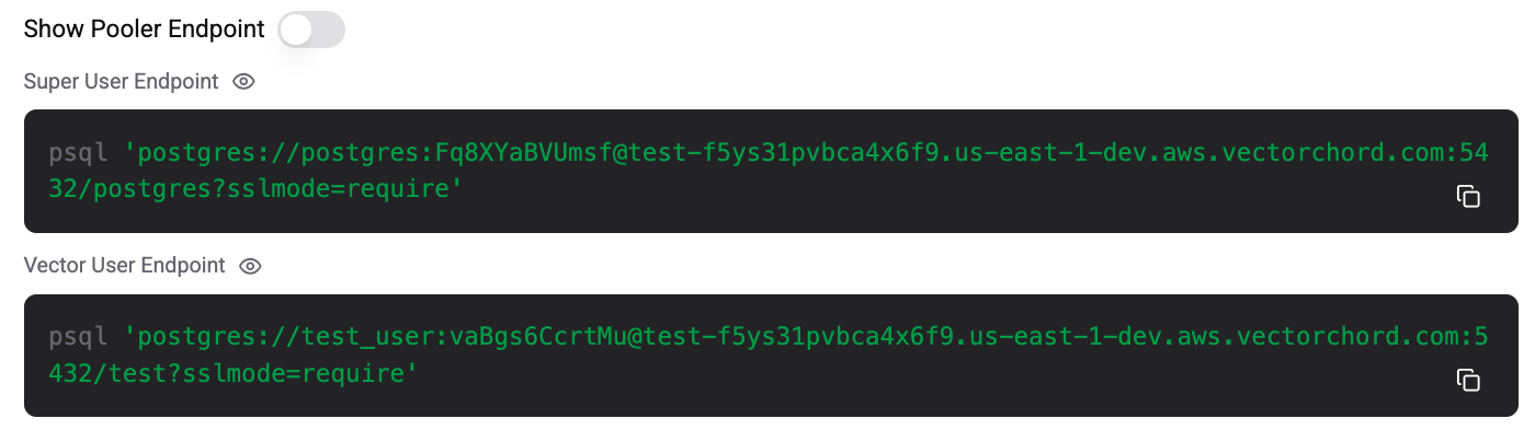 We provide two types of connection endpoints, Super User Endpoint and Vector User Endpoint respectively. For more information about the two types of connections, see Connecting with psql.